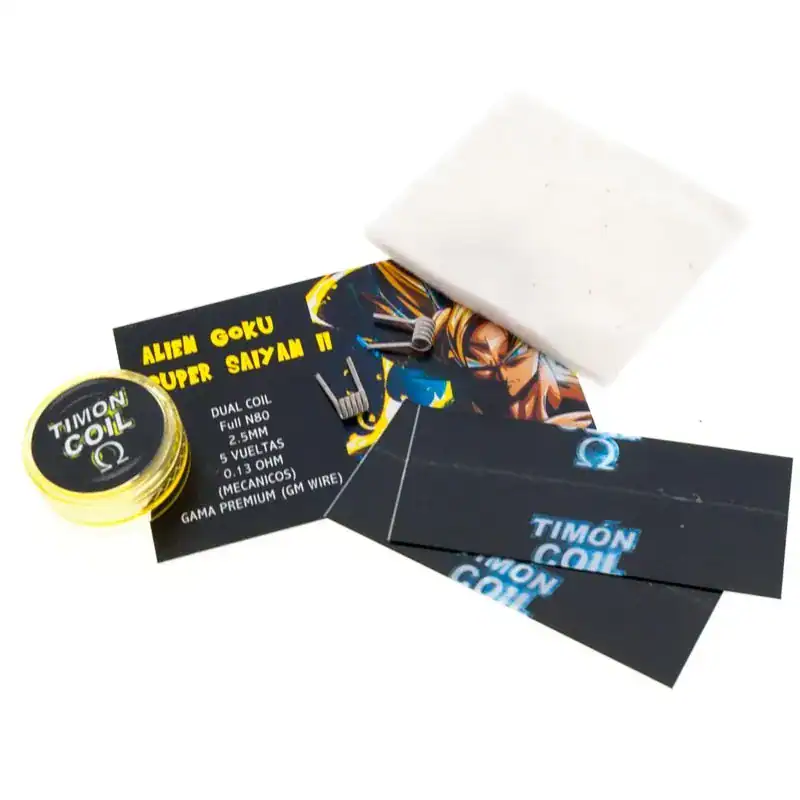 La Resistencia Alien Goku Super Saiyan II de Timón Coil es una resistencia artesanal fabricada con hilo Premium GM Wire de N80, en guía de 2.5mm y 5 vueltas. Proporciona 0.13 ohm en dual y te sorprenderá por su explosión de sabor y vapor.