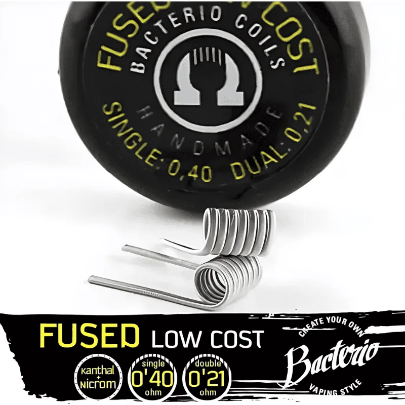 Las resistencias artesanales de Bacterio Coils son de los mejores que podemos encontrar en la actualidad, con una amplia gama de resistencias y una personalidad propia. Bacterio Coils Fused Low Cost está enfocado a las personas que se quieren iniciar con resistencias artesanales, debido a la simplicidad de construcción y la versatilidad que ofrece. Está hecho a 7 vueltas y 3mm para dar 0,4ohm en single y 0,21ohm en dual.