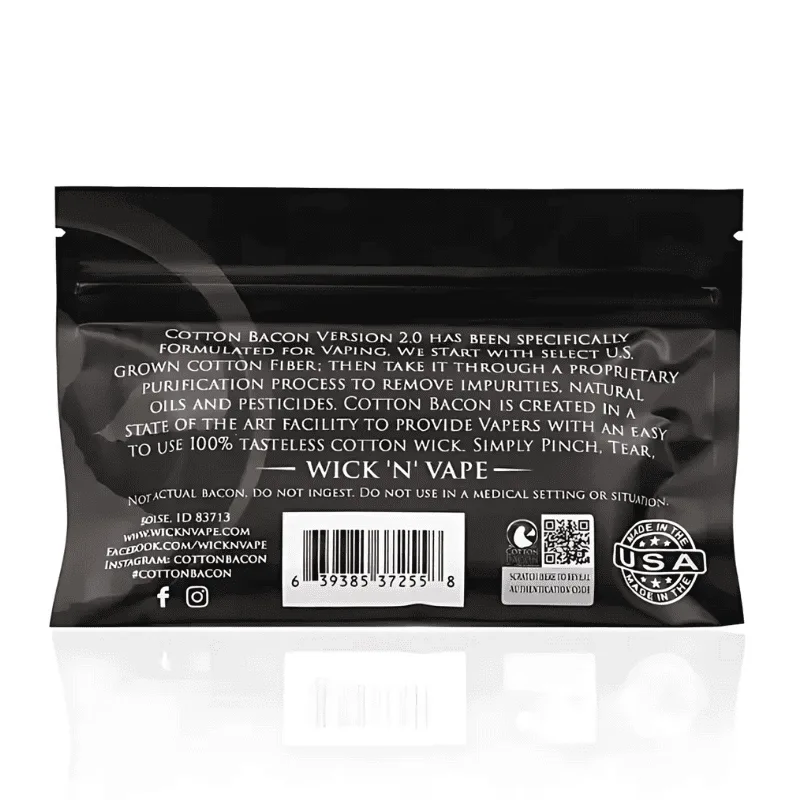 Wick N Vape Cotton Bacon V2 tiene una formula especial para vapeadores. Excelente fibra de algodón procedente de Estados Unidos, tratado a través de un proceso de purificación patentado para eliminar impurezas, aceites naturales y pesticidas. Cotton Bacon V2 se crea en una instalación de vanguardia para proporcionar a los vapers una mecha de algodón 100% insípida y fácil de usar.